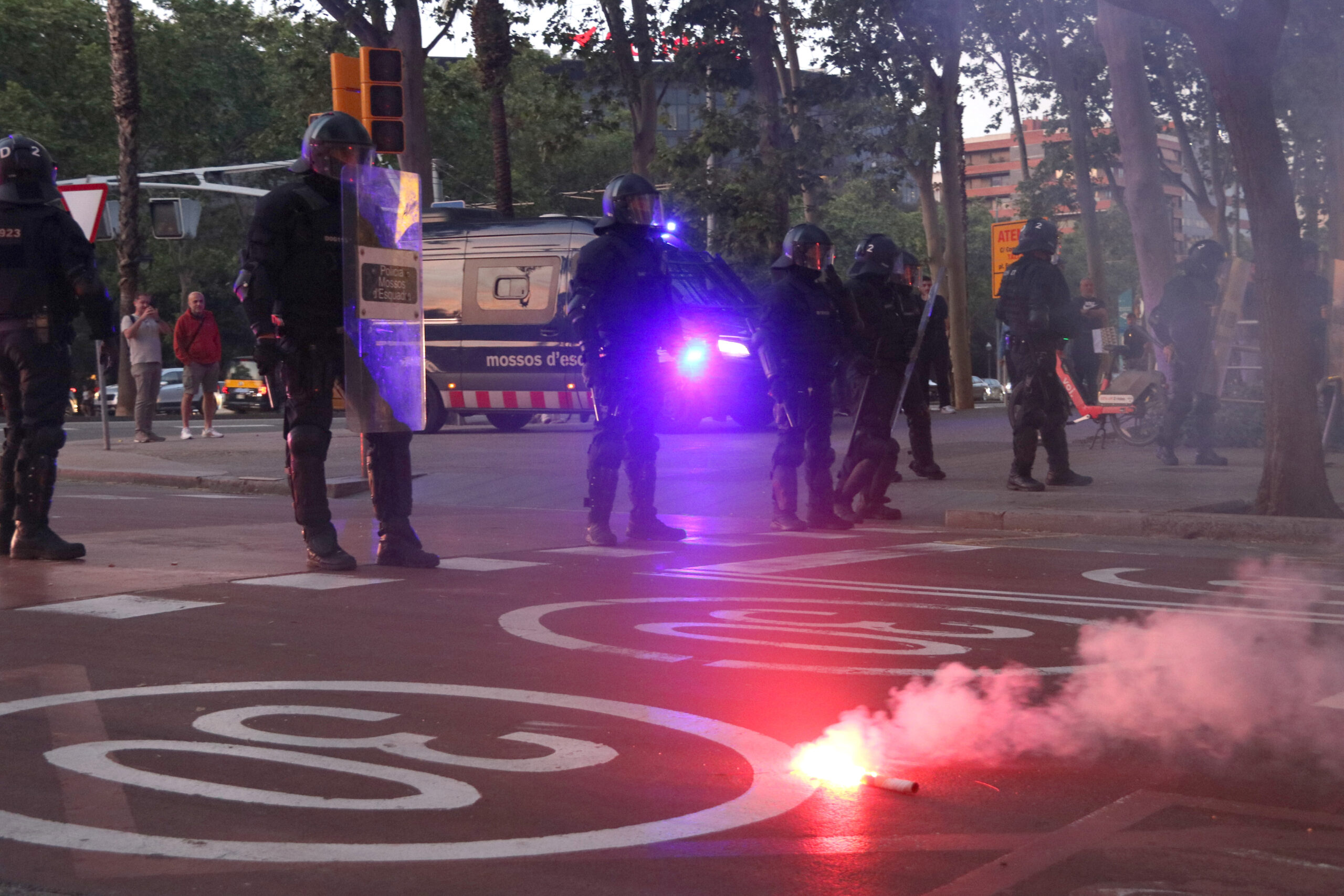 ACN Barcelona – La manifestació a Barcelona en protesta per la intercepció de la Flotilla per part d’Israel ha acabat amb llançaments d’objectes contra la línia policial que protegeix el consolat d’Israel i càrregues dels Mossos d’Esquadra. Més de 300 persones han participat en una marxa que ha sortit passades les 20 hores des de la plaça de Sants i s’ha encaminat cap al consolat, situat a la Gran Via de Carles III. Els Mossos d’Esquadra, però, no els han deixat apropar-se i han format una línia policial. Un grup d’encaputxats han llençat objectes, sobretot ampolles i pots de fum, contra la línia d’antiavalots al carrer Gandesa amb l’avinguda Diagonal. Els manifestants també han bolcat una desena de contenidors i posteriorment s’han produït les càrregues.