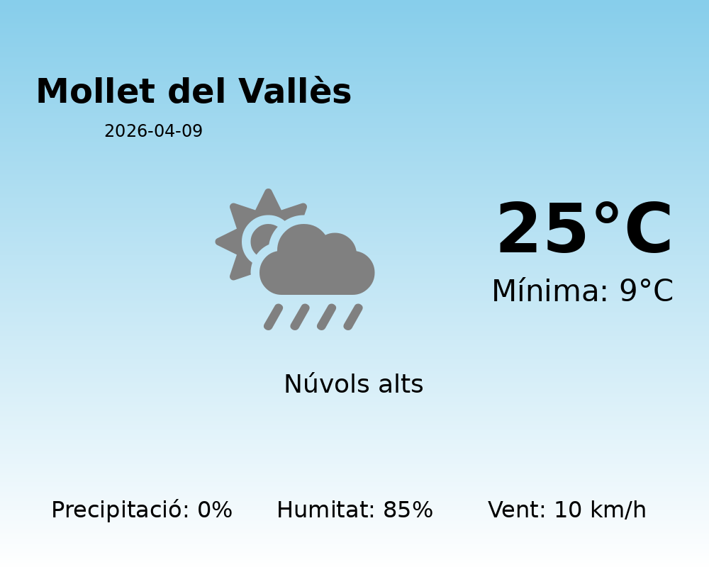 En aquesta jornada del 9 d’abril de 2026, Mollet del Vallès gaudirà d’un dia predominantment serè, amb un estat del cel marià, indicant que es podrien observar alguns núvols prims al llarg del dia però sense cap amenaça de precipitació. La probabilitat de pluja és del 0%, oferint així una excel·lent oportunitat per planificar activitats a l’aire lliure.