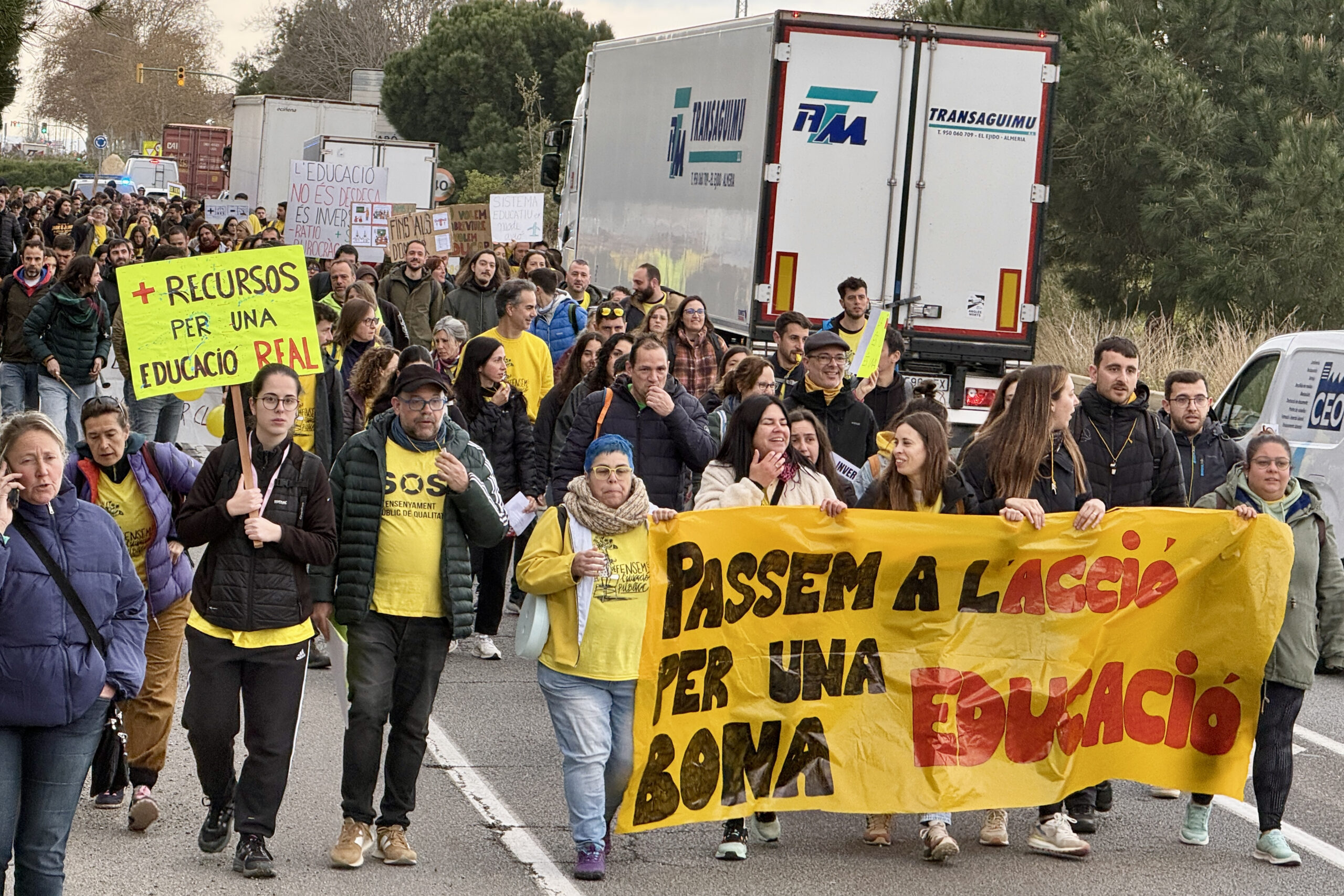 D’altra banda, mig miler de persones, acompanyats d’una quarantena de tractors de Revolta Pagesa, s’han concentrat a Girona, davant del pavelló de Fontajau. Els manifestants, docents i pagesos, simulen una classe, amb pupitres i una pissarra.
