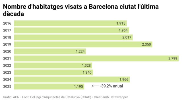 ACN Barcelona – Els habitatges de nova creació visats a Catalunya van caure un 7,5% anual durant el 2025, fins als 16.128 immobles, un descens després del repunt del 2024, quan es van visar grans promocions d’habitatge de protecció oficial, segons les dades publicades pel Col·legi d’Arquitectes de Catalunya (COAC) aquest dijous. Aquest exercici ha estat marcat per l’alentiment de l’edificació a la demarcació de Barcelona i, especialment, a la capital catalana que ha experimentat una davallada de gairebé el 40%, amb 9.465 habitatges visats. El COAC ha atribuït aquest descens a la manca de sòl disponible a la ciutat i a les regulacions com la reserva del 30% de les noves promocions per a habitatge protegit.