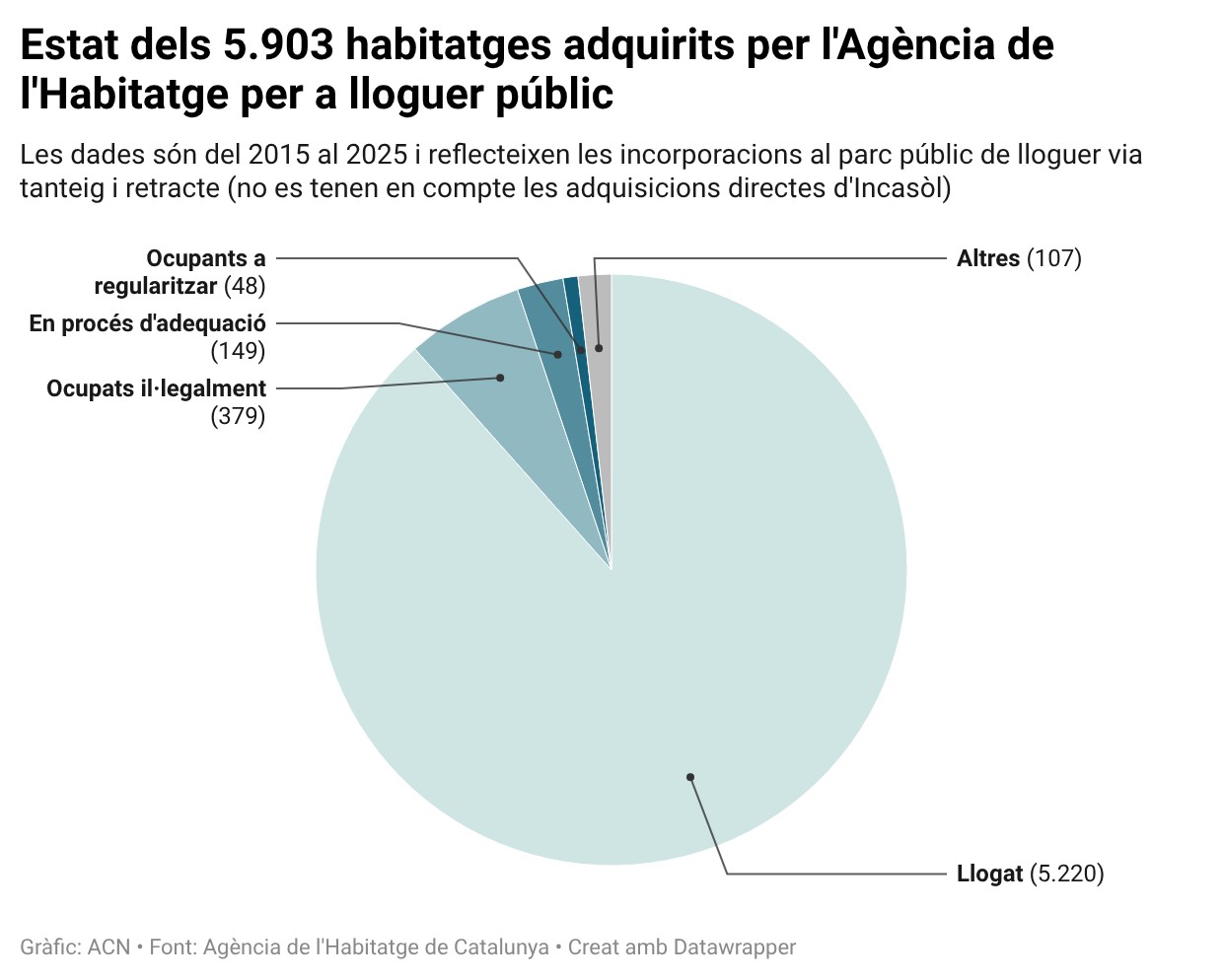 La gran majoria dels pisos adquirits entre l’aprovació del decret llei de mesures urgents sobre habitatge del 2015 i el mes d’octubre del 2025 per part de l’AHC són per mitjà del tanteig. És a dir, per la preferència que té la Generalitat a l’hora d’adquirir un habitatge quan prové d’un procés d’execució hipotecària, quan és d’un gran tenidor persona jurídica en una zona declarada mercat residencial tensat o bé quan prové d’una subhasta administrativa o judicial. En concret, l’administració catalana ha aconseguit 5.807 habitatges per aquesta via, als quals s’hi han d’afegir 96 més per retracte, és a dir, el mateix mecanisme, però quan la Generalitat detecta que tenia aquesta preferència i no se l’ha notificada abans de l’operació. En aquest cas, pot revertir la compravenda i adquirir-lo.