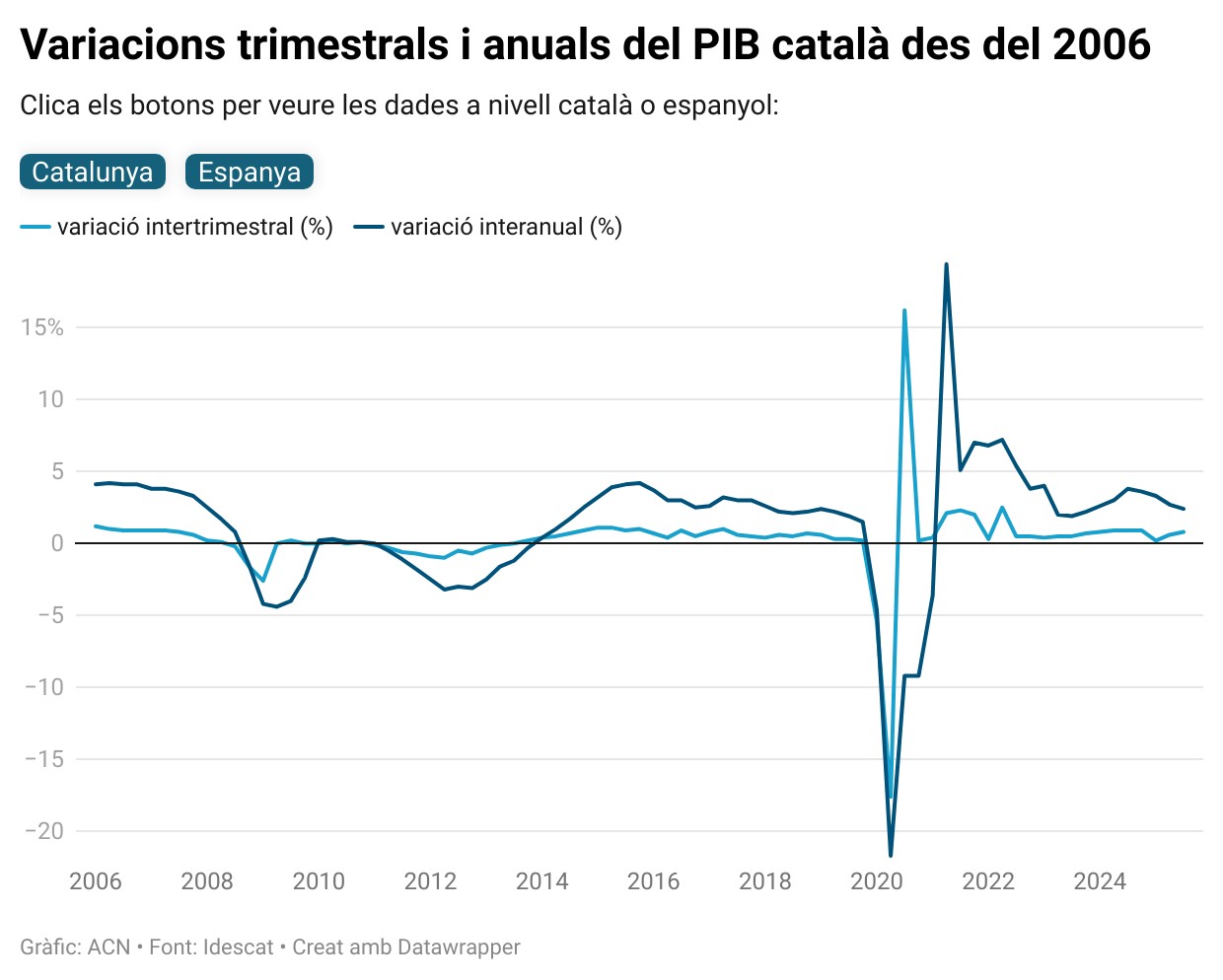 ACN Barcelona – El PIB català ha crescut un 2,4% interanual el tercer trimestre del 2025, tres dècimes per sota de la variació dels tres mesos anteriors (2,7%), segons l’Institut d’Estadística de Catalunya (Idescat). La xifra és la mateixa anticipada per l’organisme a principis de novembre i se situa quatre dècimes per sota de l’economia espanyola però vuit dècimes per sobre de la mitjana europea. L’avanç de l’economia s’explica principalment per l’evolució de la demanda interna (+3,7%), degut bàsicament a l’increment de la formació bruta de capital (6,9%) i del consum de les llars (3,5%). L’Idescat ha incrementat una dècima la variació trimestral del PIB fins al 0,8%, dues dècimes per sobre de l’espanyola (0,6%) i quatre dècimes més que la UE (0,4%).