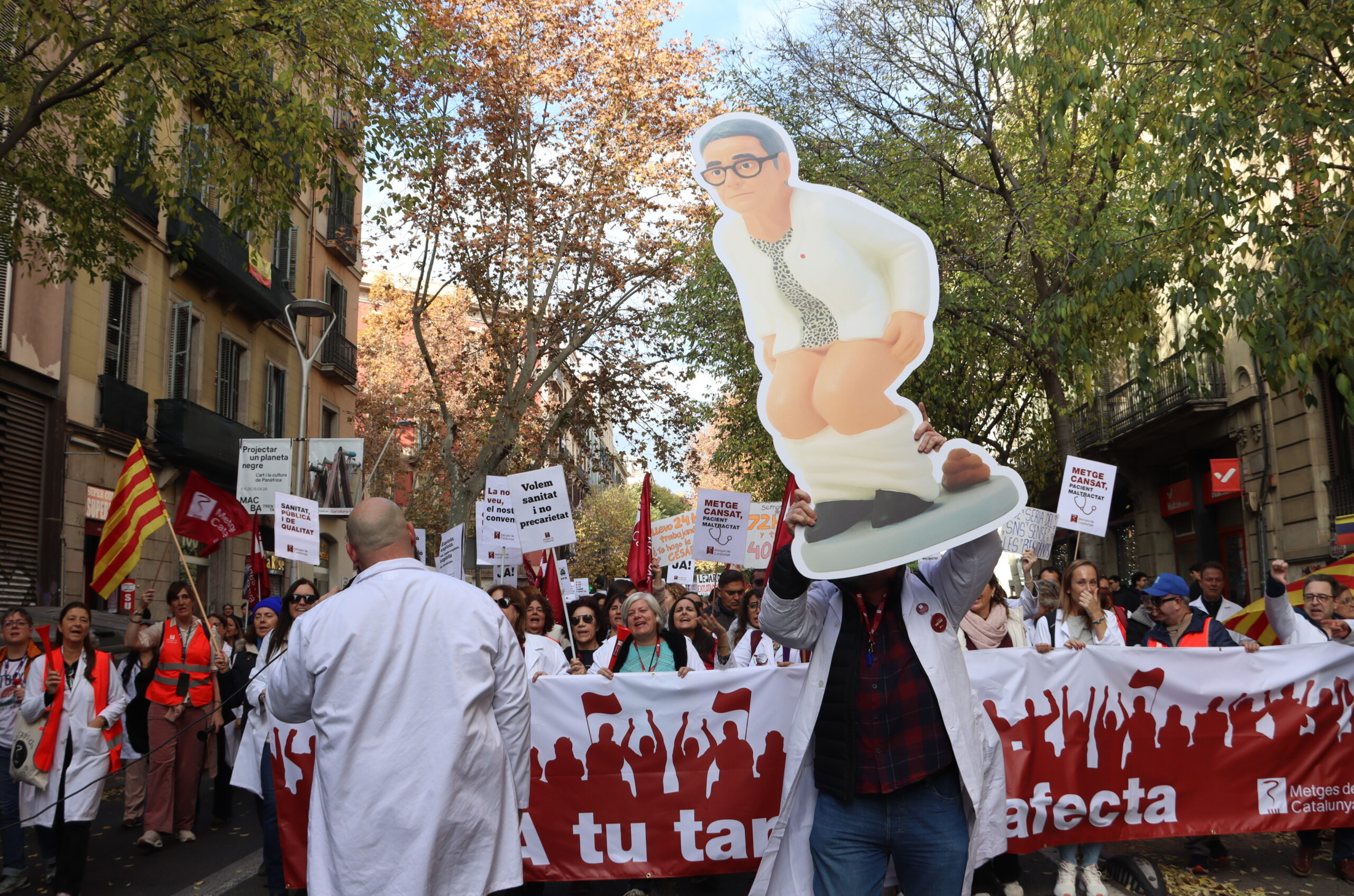A la capçalera de la manifestació, la pancarta ha buscat la implicació de la ciutadania, amb el lema “A tu també t’afecta”, i a la primera línia, també s’hi ha pogut veure una il·lustració que representa la consellera de Salut, Olga Pané, com un caganer, ja que la protesta ha tingut lloc quan falten pocs dies per les festes de Nadal.