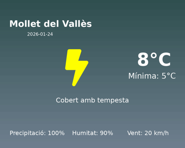 Benvolguts lectors, avui a Mollet del Vallès ens trobem amb una jornada marcada per un clima hivernal típicament humit. Amb una temperatura màxima de 8 °C i una mínima de 5 °C, el dia es presenta fred i ventós.
