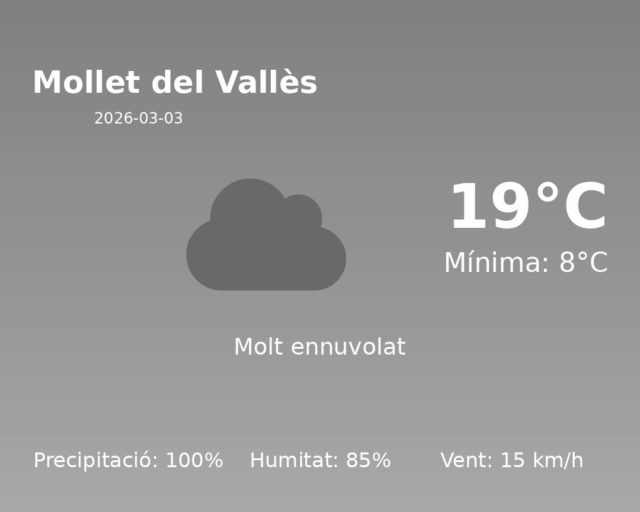 Avui, dimecres 3 de març de 2026, el temps a Mollet del Vallès es preveu variat, amb condicions que esdevenen pròpies de l’inici de la primavera. Malgrat les temperatures agradables, caldrà tenir present altres condicions meteorològiques que poden afectar les activitats a l’aire lliure.