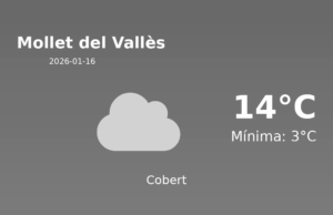 Avui, la ciutat de Mollet del Vallès gaudirà d’un clima majoritàriament estable i agradable per a aquesta època de l’any. La temperatura màxima esperada és de 16ºC, mentre que la mínima baixarà fins als 5ºC. Això suposa temperatures suaus durant el dia i cert frescor a les hores nocturnes.