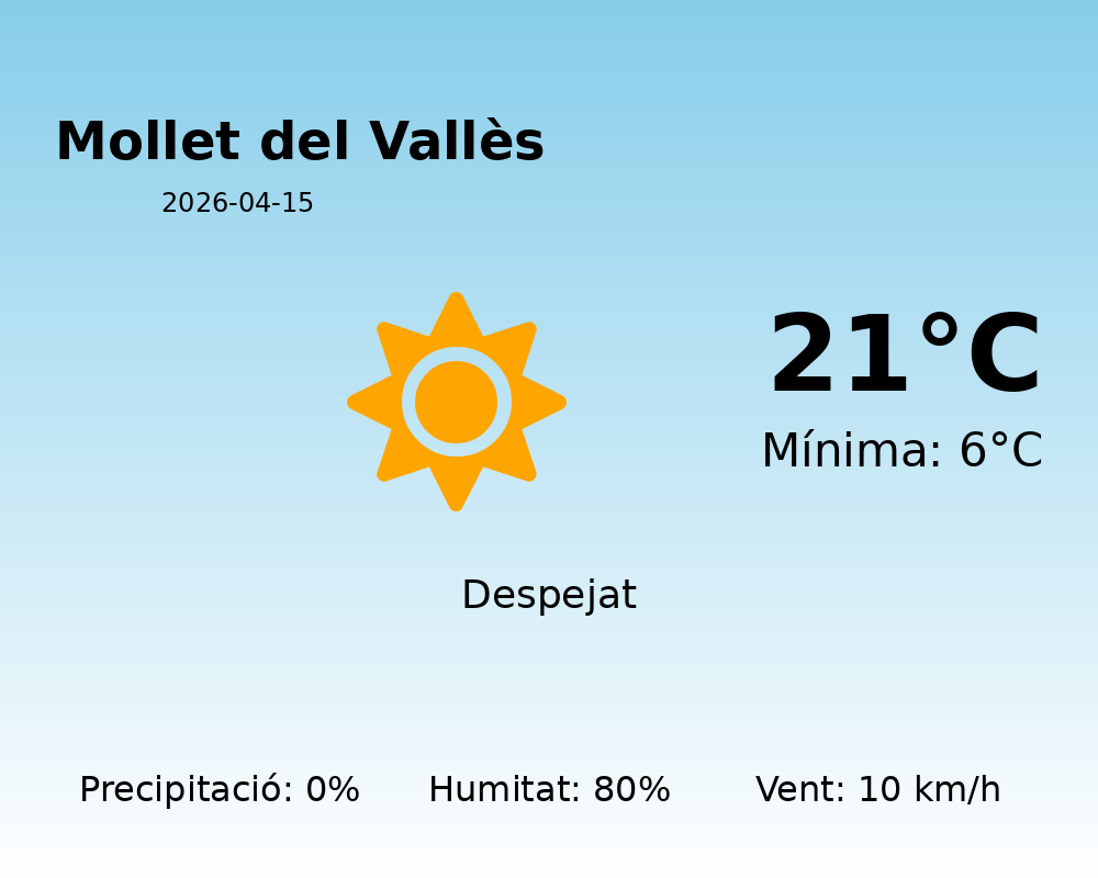 Bon dia a tots els habitants de Mollet del Vallès! Avui, 15 d’abril de 2026, tenim una jornada amb condicions meteorològiques força favorables. Aquí teniu la informació detallada sobre el temps que ens espera.