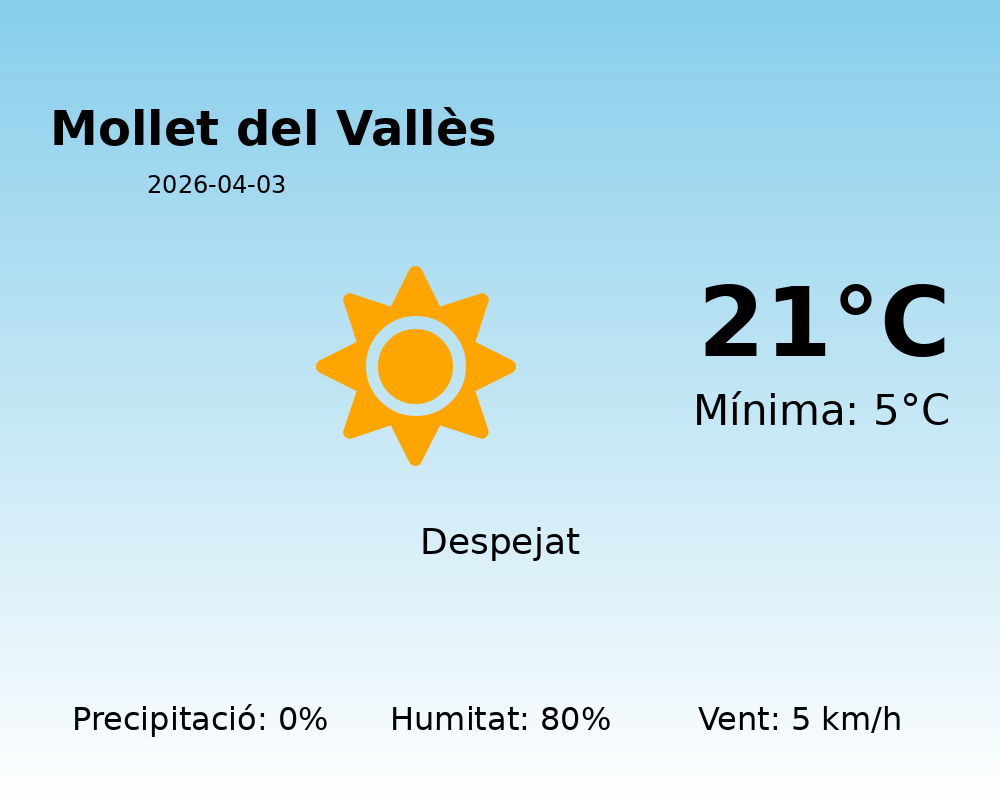 Avui, a Mollet del Vallès, es preveu un dia amb temperatures agradables i sense precipitacions.