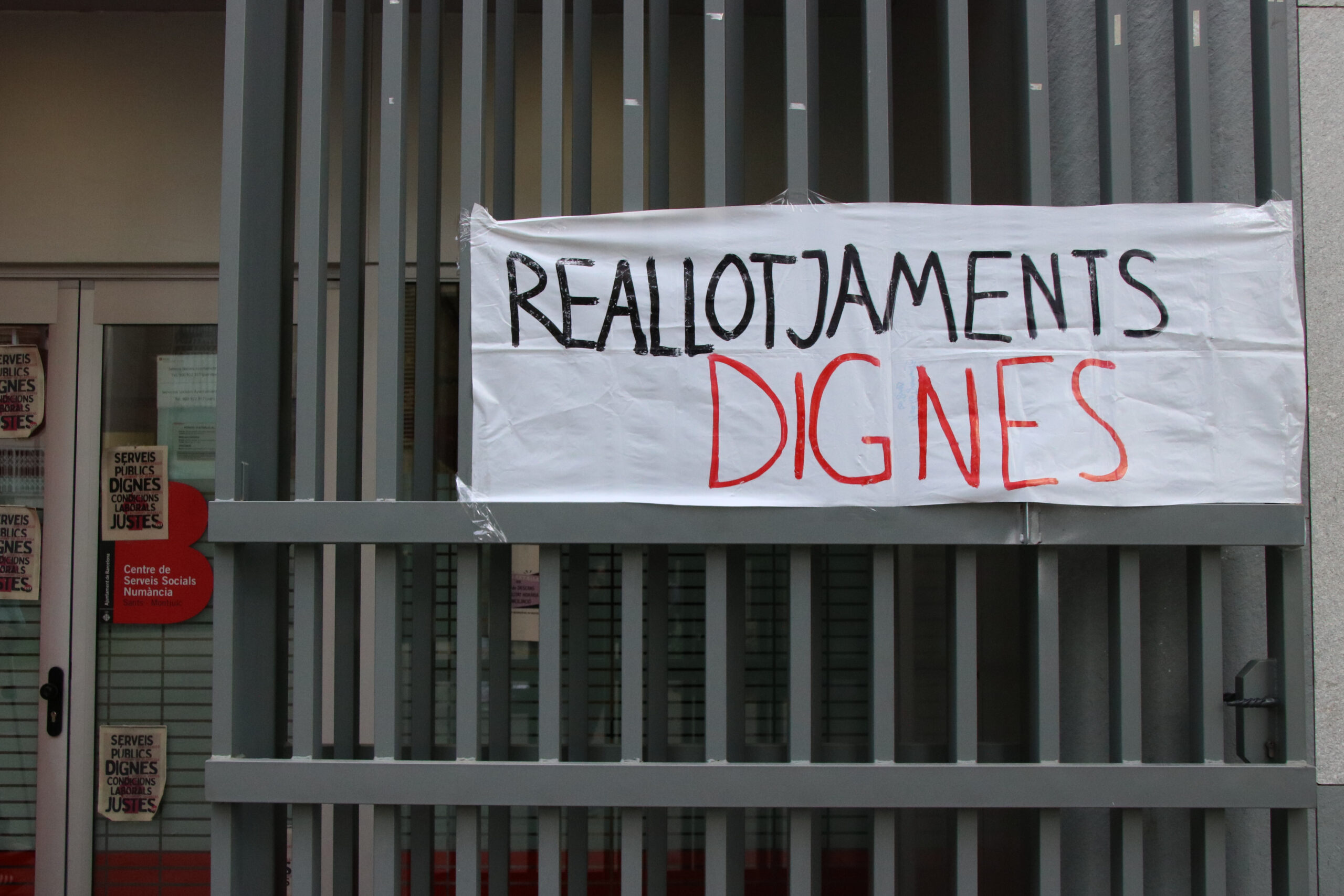 ACN Barcelona – El Grup d’Habitatge de Sants ha dut a terme, aquest dimarts, una acció reivindicativa per exigir “pisos dignes” en el reallotjament temporal de famílies desnonades. La protesta ha consistit a accedir al centre de Serveis Socials Numància, de l’Ajuntament de Barcelona, perquè la direcció els atengués. No ha estat únicament per la situació que viuen aquestes persones, també per denunciar el cas de l’Abdul. El van desnonar fa més d’un any d’un immoble, a Badal, i li han atorgat una habitació per la zona de la Sagrada Família. Ha explicat que viuen cinc persones en aquest espai, ell amb la seva dona i tres fills menors. L’Abdul ha precisat que destina uns 50 minuts per dur els nens a l’escola i ha dit que ja ha demanat el trasllat.